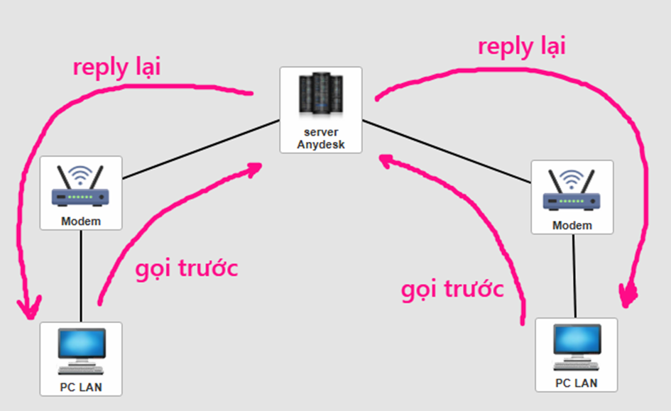 Một số các công nghệ khác như STUN, WebRTC ... vẫn chỉ dựa trên 1 nguyên tắc là PC khi bật app (anydesk, Ultraviewer...) sẽ chủ động gọi ra ngoài 1 con server trung gian trước