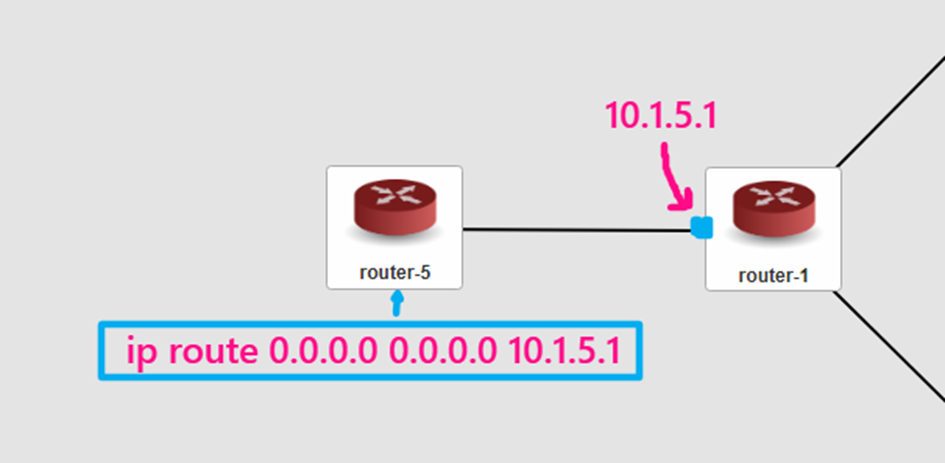 ip route 0.0.0.0 0.0.0.0 10.1.5.1 (Với 10.1.5.1 là IP của R1, gọi là nexthop của R5)