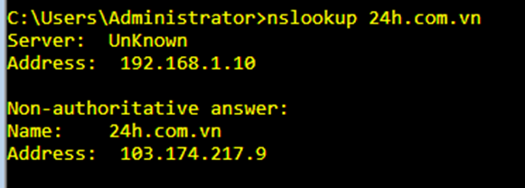Gõ thử nslookup 24h.com.vn