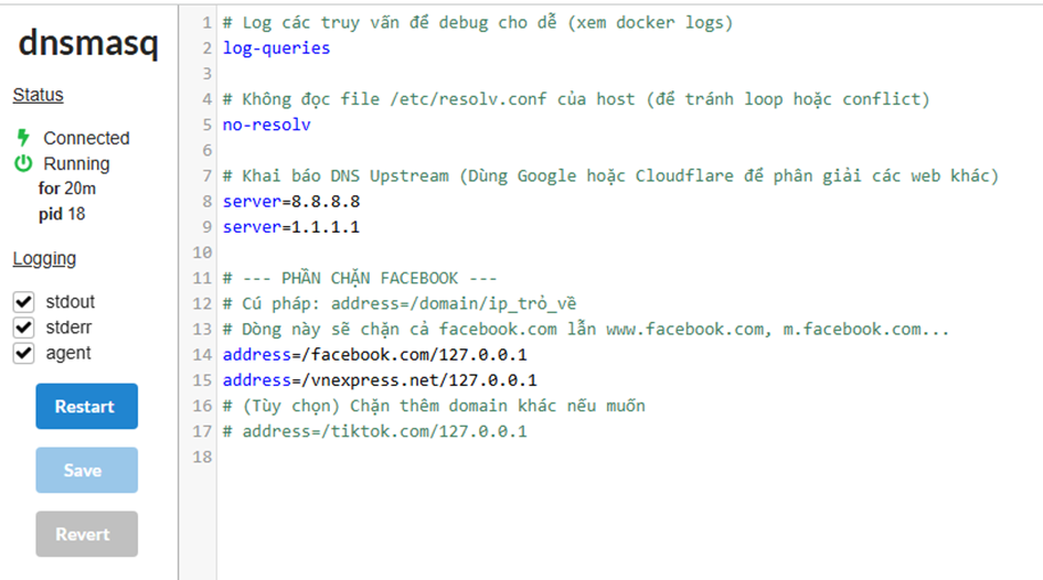 docker logs -f my-dns-server để xem log request DNS