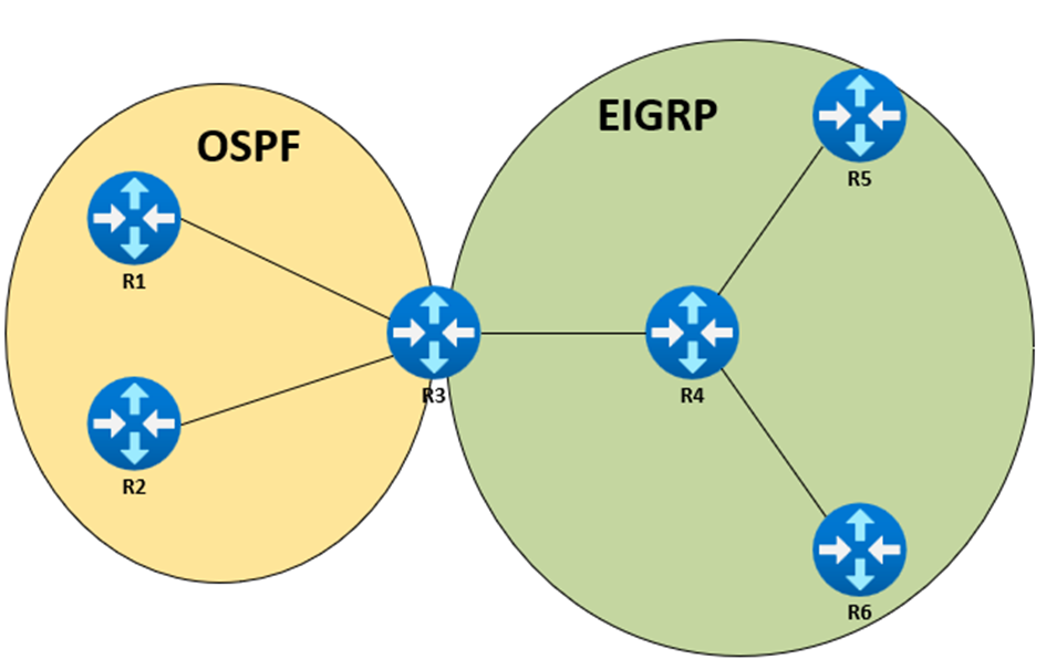 Nhưng nhiều khi công ty lại có nhiều chi nhánh; ví dụ chi nhánh chính (HQ chạy OSPF) đấu nối sang chi nhánh phụ ; mà ở chi nhánh phụ chạy EIGRP chả hạn như mô hình dưới: