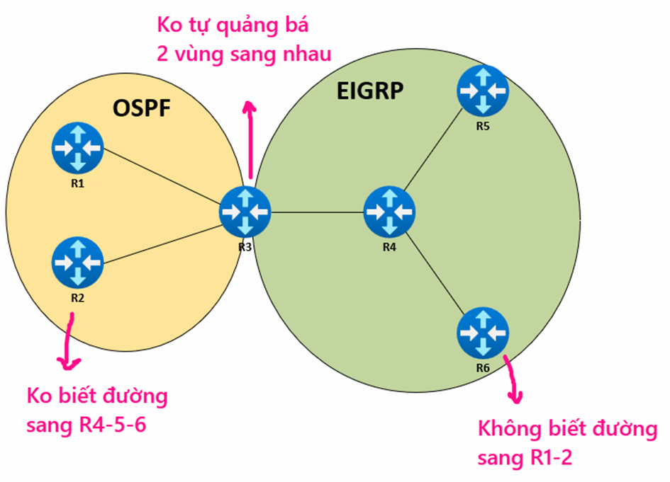 Khi đó các router ở HQ (Cam) cần biết đường tới các Router Xanh bên EIGRP, và ngược lại. Theo mặc định thì chỉ có con biên (tức là R3) là nó biết đường đi tới cả 2 vùng, nhưng nó KO TỰ THÔNG BÁO với các router bên CAM về đường đi sang bên XANH, và ngược lại.