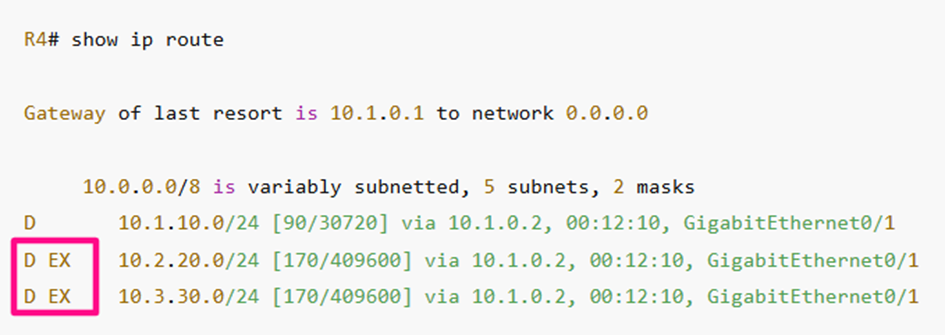 Kí hiệu D EX trên nghĩa là các router R4-5-6 đang chạy EIGRP và học route này từ vùng khác (OSPF)