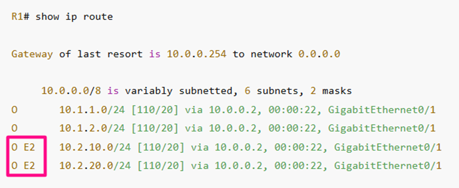 “O E2” nghĩa là con R1,2 đang chạy OSPF và nó học route từ vùng ngoài vào (EIGRP).