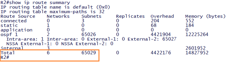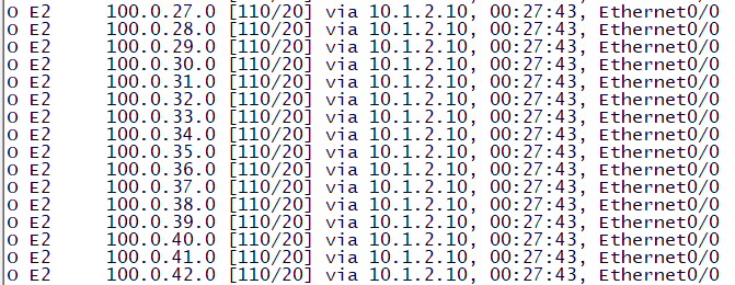 ip route 100.0.0.0/24 Null0 ip route 100.0.1.0/24 Null0 ip route 100.0.2.0/24 Null0 ...Dùng script tạo ra ngàn chục ngàn dòng... router ospf redistribute static exit end |
