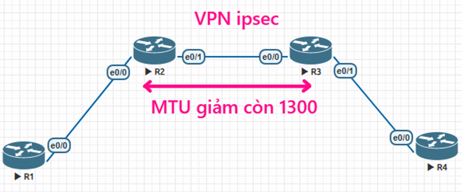Sau khi cấu hình xong VPN IPSEC cơ bản giữa R2 và R3 thì ta thử hạ MTU của cổng wan xuống còn 1300, sau đó từ R1 ping sang LAN bên kia (là R4), với gói 1400 bytes xem VPN nó drop hay phân mảnh.