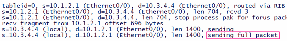 Thử debug ip packet tại đầu R4, thì thấy R4 có nhận 2 gói từ R1, và bị phân mảnh (dòng có s=10.1.2.1 bên dưới)
