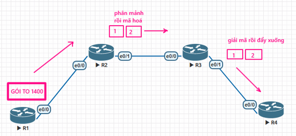 Chứng tỏ là ở trong VPN khi nhận được gói từ R1, bị quá MTU, nó sẽ phân mảnh ra thành 2 gói nhỏ rồi mới mã hoá, nên là khi đi sang R4, đã giải mã thì R4 mới nhận được 2 gói.