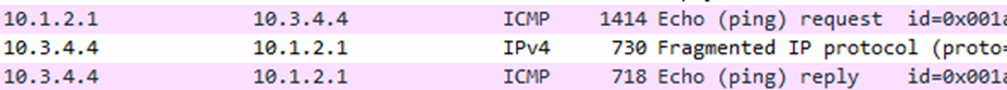Sau đó ta bắt tại R1cũng thấy gói reply từ R4 cũng bị phân mảnh ra thành 2 gói nhỏ ( có source là 10.3.4.4)